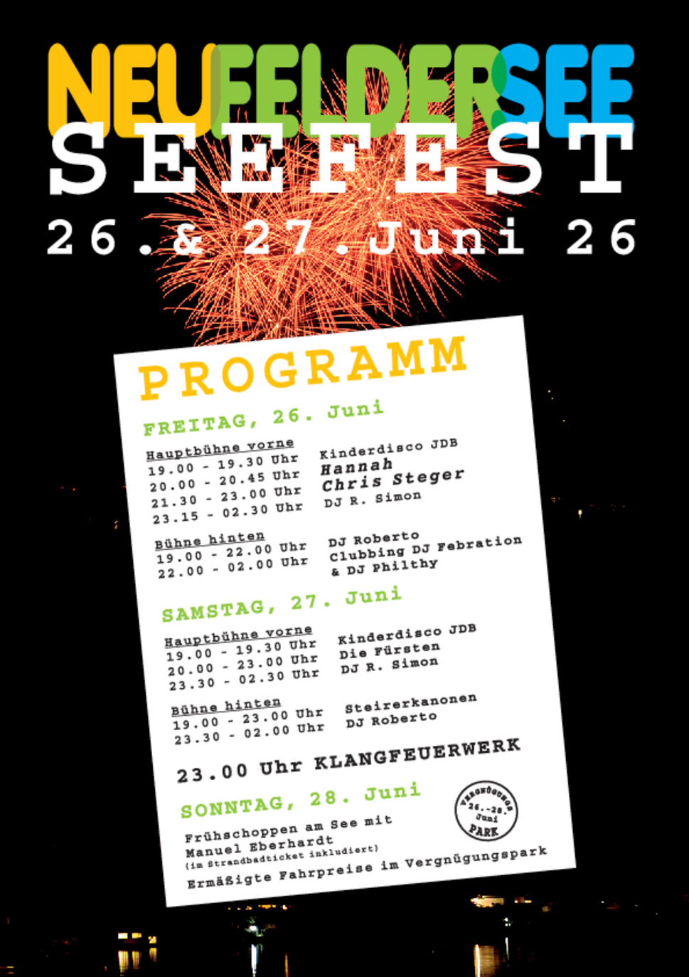 Am Freitag, den 26. Juni findet das Open Air Konzert mit Chris Steger im Rahmen des diesjährigen Seefestes statt. Das Klangfeuerwerk ist am Samstag, 27. Juni um 23.00 Uhr. Tickets erhalten Sie bei der Strandbadkassa, im Onlineshop oder über Ö-Ticket.